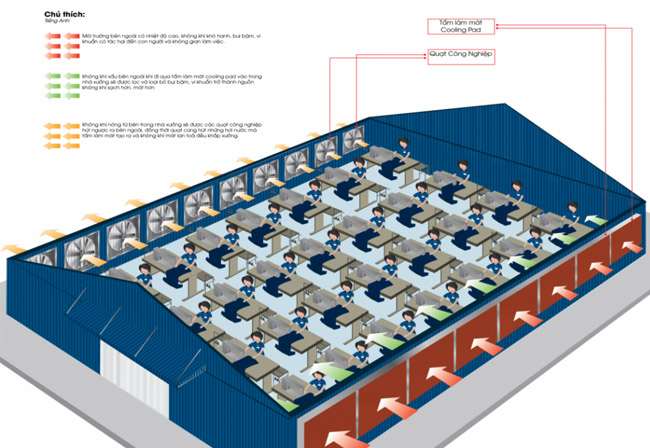 P/S : Để đạt hiệu quả thông gió làm mát cao hơn nữa ta lắp đặt thêm tấm màng dẫn động PVC với độ cao cách đất khoảng 2.4m , để lượng không khí lưu thông xuống bên dưới nơi công nhân làm việc